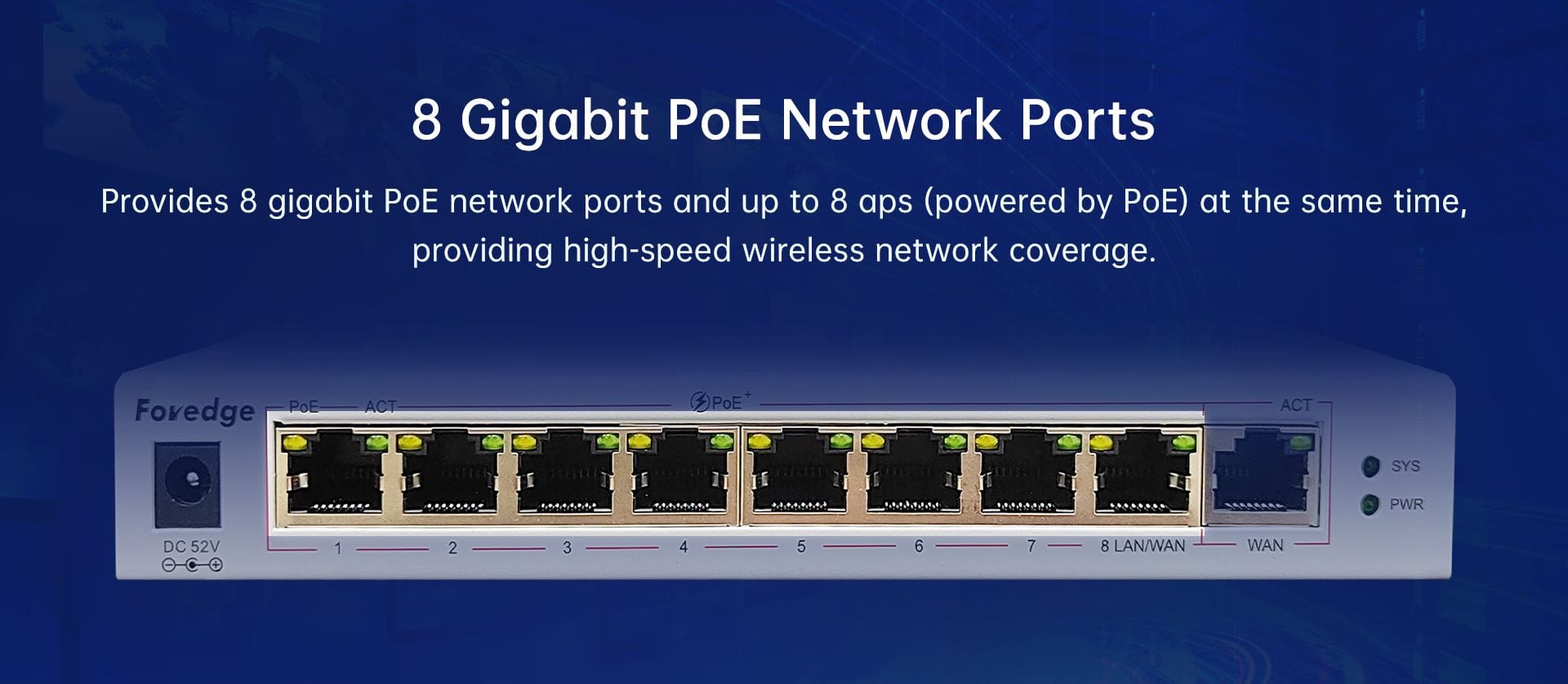 | Port | • 1 * 10/100/1000M RJ45 WAN Port • 1 * 10/100/1000M RJ45 LAN Port/WAN Port(Support PoE) • 7 * 10/100/1000M RJ45 LAN Ports(Support PoE) |