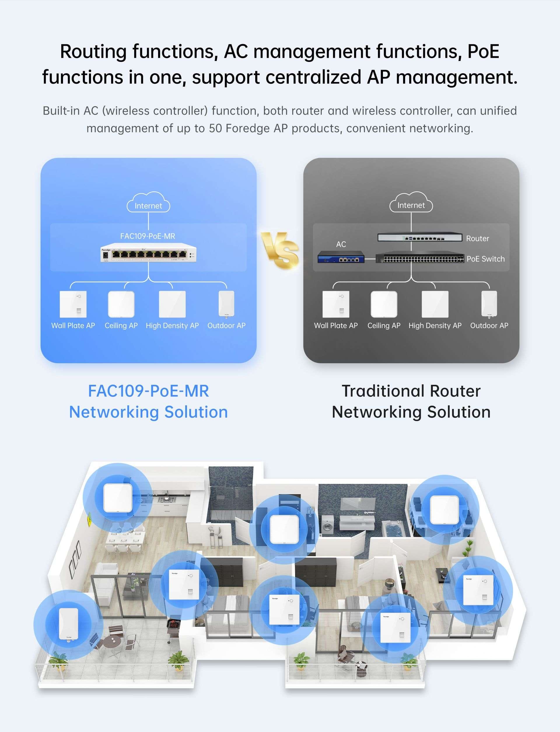 | AP centralized management | • Centralized AP management: Configure templates, AP access lists, load balancing, intelligent roaming, RF tuning, wireless network mode, and upgrade management • AP Settings, unified management of 50 Fengrunda AP products; • Plug and play; |