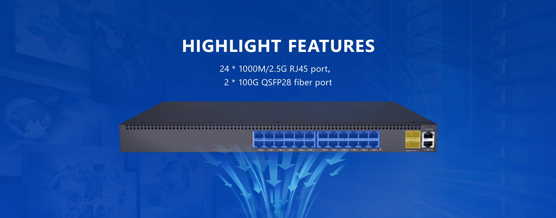 | Network Interface | ●24*1000M/2.5G RJ45 port ●2*100G QSFP28 fiber port ●1 Console port,1 Management Port |